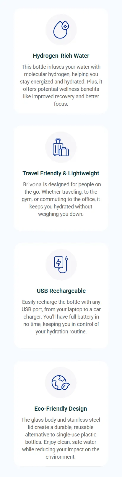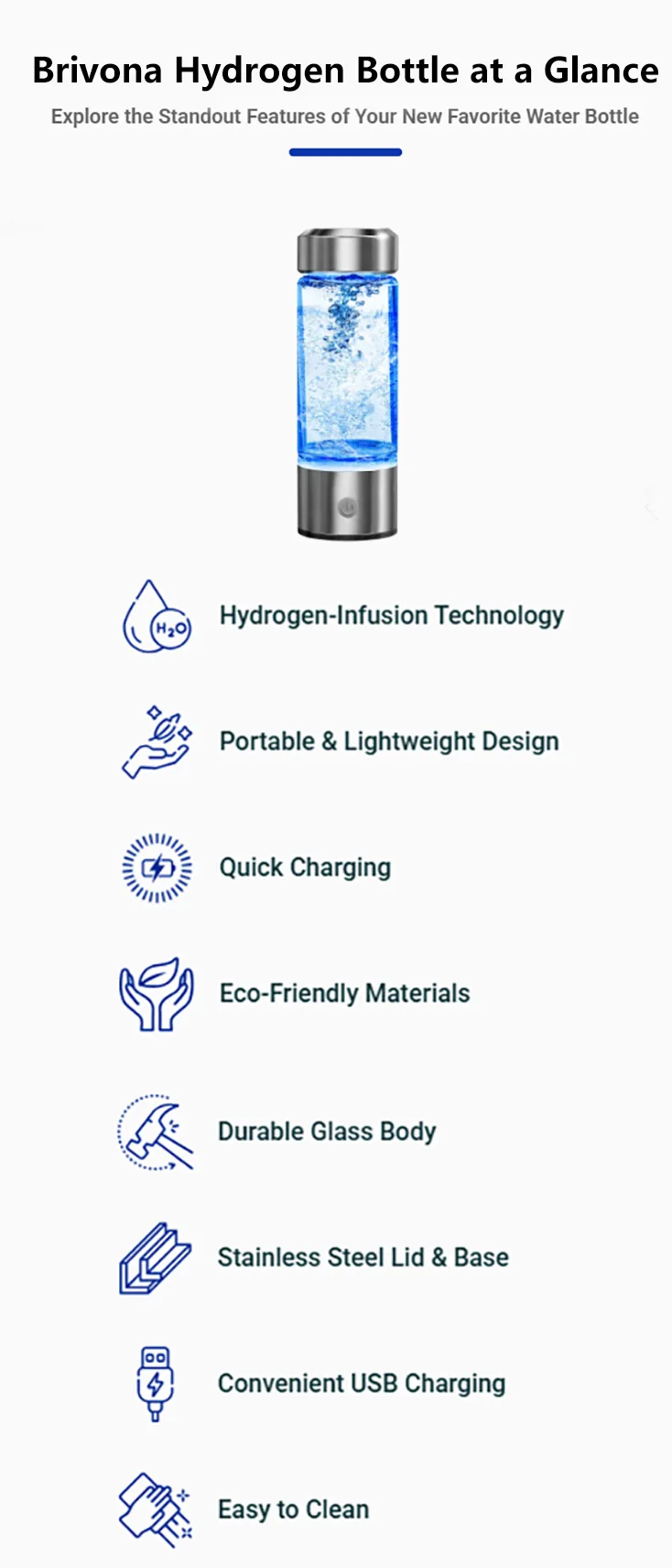 Absolutely! The Brivona bottle is made from high-quality, durable materials, including a glass body and a stainless steel lid. It’s designed for safe, daily use and contains no BPA or harmful chemicals that could leach into your water. The hydrogen infusion process is entirely secure and beneficial.