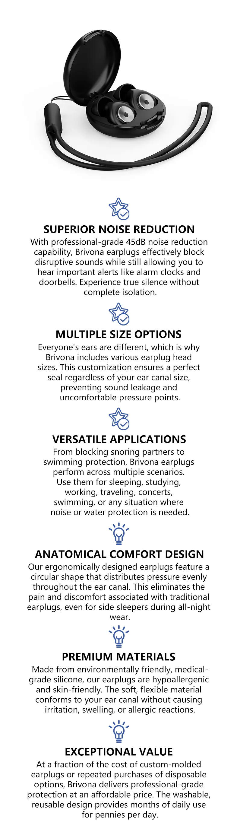 Brivona earplugs go beyond bedtime use with their versatile, waterproof design. Use them for peaceful sleep, concentrate in noisy work environments, protect your hearing at concerts or loud events, block distractions while studying, or keep water out while swimming. Their durable construction and washable materials make them ideal for daily use across all these scenarios.