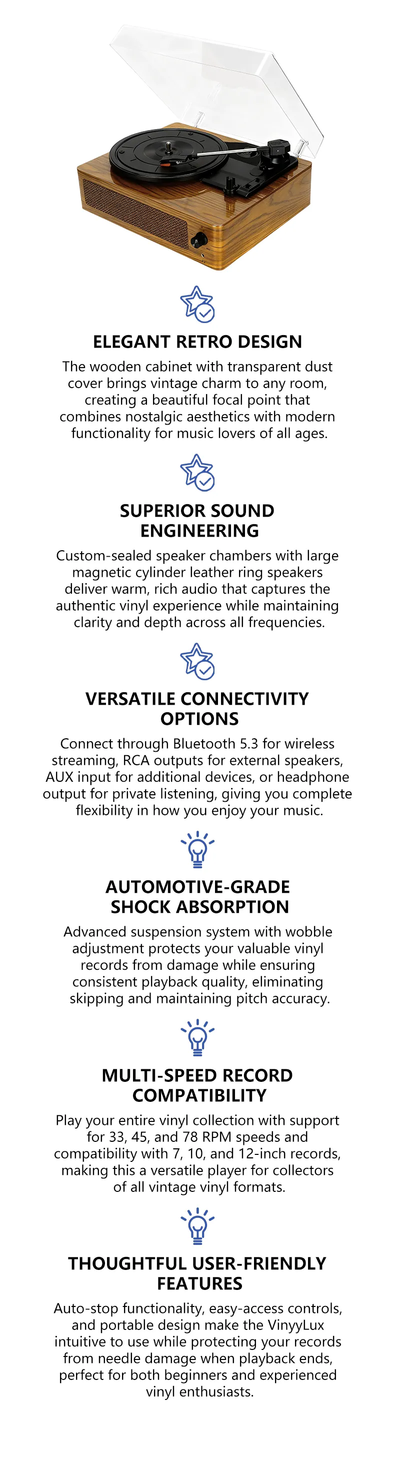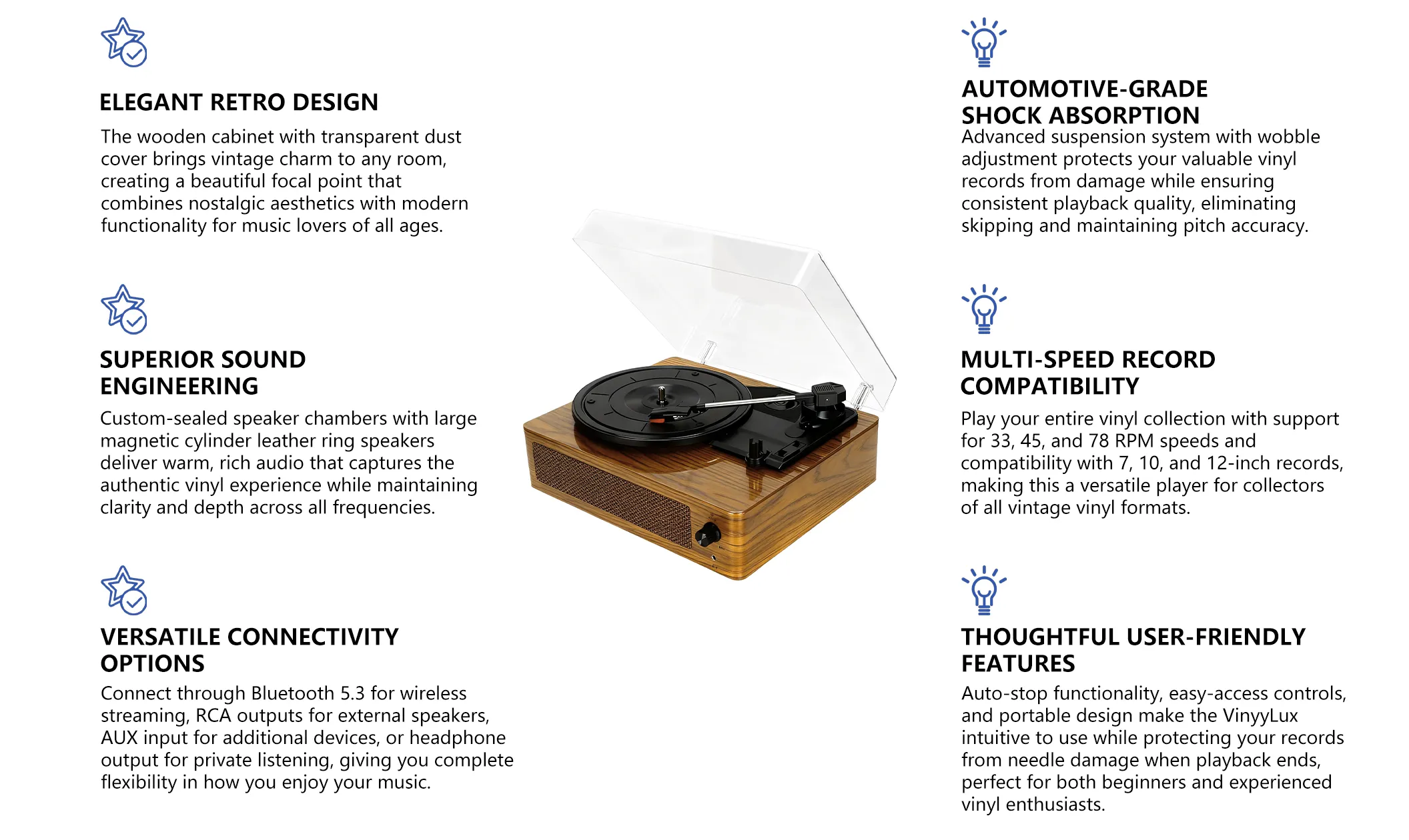- Auto-Stop Function - Automatically stops at the end of playback to prevent stylus wear and extend lifespan.